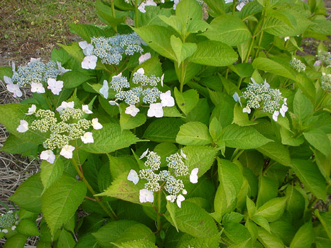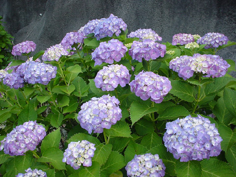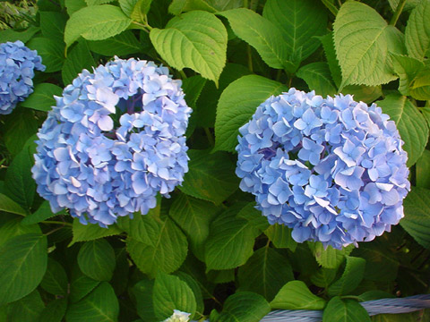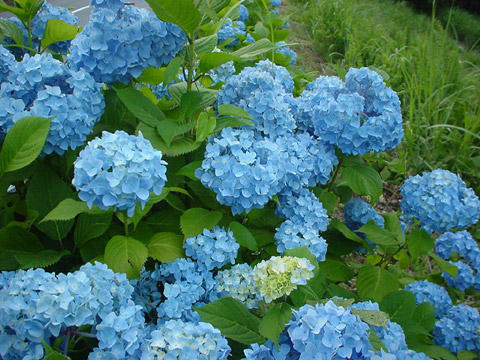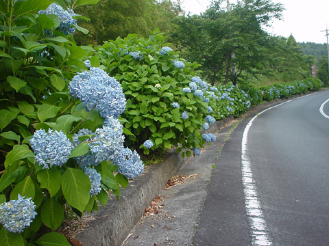 国道442号線から黒木中学校の前の橋を渡り山道を登って行くとグリーンピア八女の通用門が見えてきます。 その門をくぐり園内の幹線道路を通るのですがその道筋約3kmの両側に赤、青色などのアジサイ約5000株が見事に咲いていました。