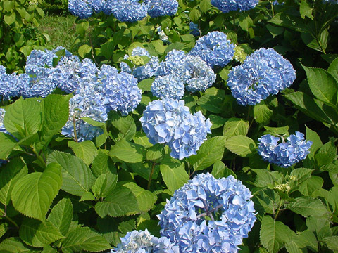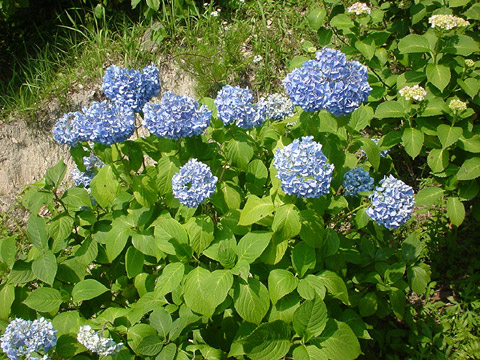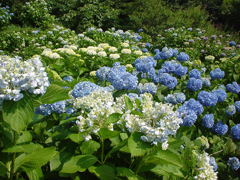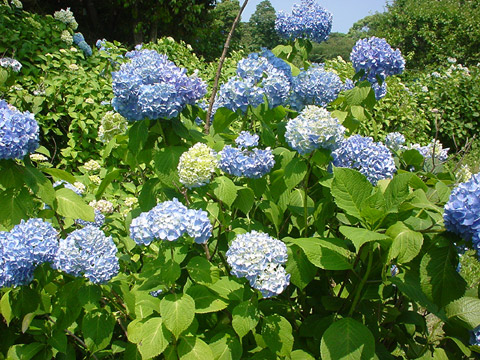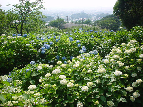 町のシンボルである若杉山の中腹に位置し、須恵町はもちろん、遠くは志賀島、博多湾、糸島半島までを見渡せる眺めのいい公園です。 この園内にあじさい園があります。青色が主体の2000株が山の斜面に咲いていました。 四季折々の自然が楽しめるという事で町の名所になっており、特につつじは有名との事です。