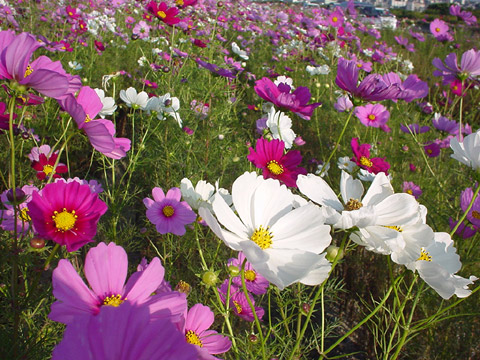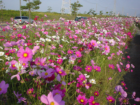 若松の埋立地南側を走る国道495号沿いの向洋橋から脇の浦入口交差点の約2.8kmにわたって、市民参加により植えられたコスモスの花は、情緒があり海からの風を受けて気持ちよく咲いていました。 その数約120万本。一直線で真っ直ぐな「綺麗な道」で響灘が背景の道沿いにあるので、ドライブしながら海と花をながめられます。駐車場もあるので散策して楽しめます。