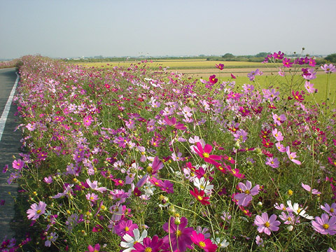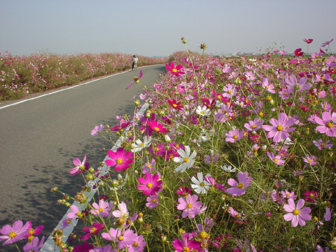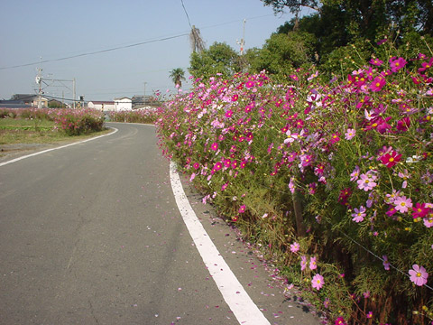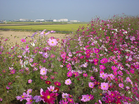 筑後川の堤防一帯の水田地帯が実る秋、赤、ピンクを中心にさまざまな色に彩られたコスモスが、陣屋川沿いに4.3キロも続き私達の目を楽しませてくれます。 運動不足の方などには、もってこいの場所で、貸し自転車もあり日ごろのストレスが解消されます。