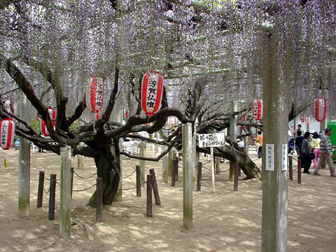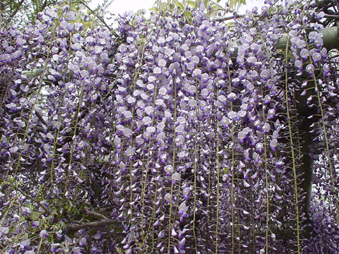 樹齢百数十年を数えるここの藤の木は、第三十一世住職の手で植樹されたと伝えられています。 3本の藤が境内いっぱいに広がり、たくさんの花房が垂れ下がっていました。 手入れも行き届き、寺の関係者や地域の皆さんの手で暖かく見守られている感が伝わってきます。 又、ここの藤は、町の天然記念物に指定されています。
