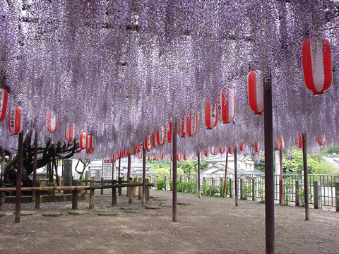 境内にある樹齢約500年の藤は幹回り約3.7m、800㎡にわたって棚を広げていました。 数年前には樹医の「大手術」を受けたそうですが、住職の方々などが肥料を与えるなどして、今年も薄紫の花をたくさんつけていました。 又、この藤は市の天然記念物に指定されています。