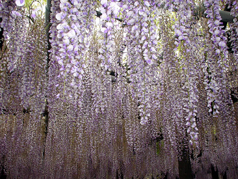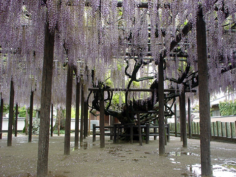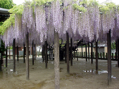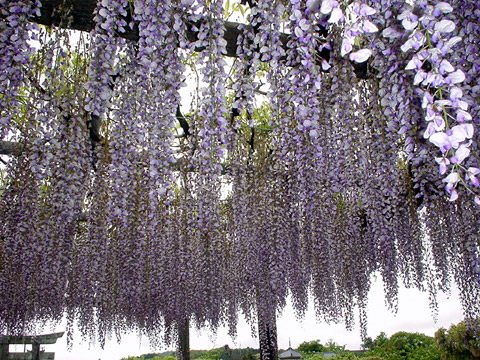 上高場大神社にある藤の里公園は、樹齢約100年。根回り2.7m、棚面積約420㎡のみごとな藤が咲いていました。 町の天然記念物にも指定されており、三輪町の町花にもなっています。