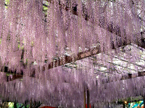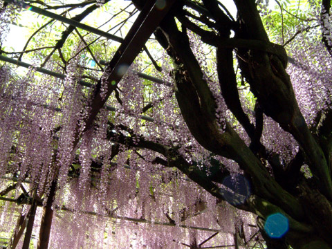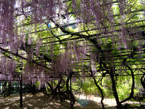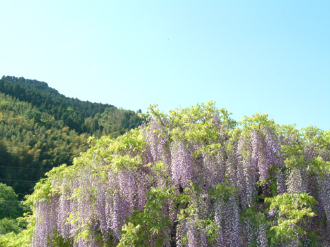 黒木町の国道442号線そばにある素盞鳴(すさのお)神社の境内に樹齢600年の大藤があります。 この藤は応永2年(1395)後征西将軍良成親王が植栽されたと言われています。 満開時には数千万の花房が0.5m~1.5mにも垂れ下がり、清楚な香りをあたり一面に漂わせます。 国の天然記念物にも指定されています。