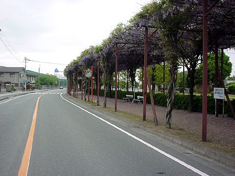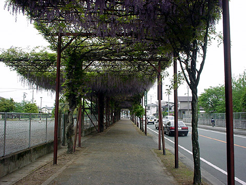 おそらく九州では一番長いと思われる藤棚がここ八女の旧矢部線福島駅跡の歩道にあります。 その長さは、510m。歩道の為、横幅こそありませんがその長さには驚きました。 又、藤棚を組んである骨組みに旧矢部線の鉄道のレールが使用されていることには何か考えさせられるものを感じました。