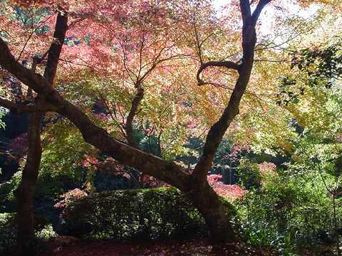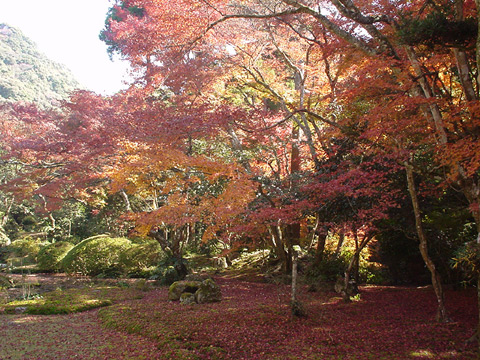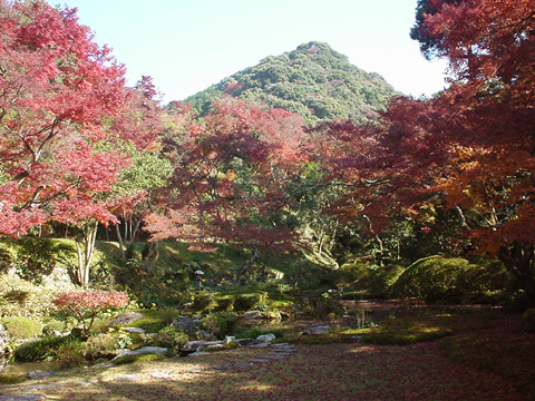 確かではないそうですが、室町時代の僧で水墨画の絵師としても知られる雪舟の造園といわれている日本庭園です。 東南北に山を囲らし心字の池を中心に庭石、滝など自然と人工の美が溶け合い、春夏秋冬いつ訪れても飽きない名園で、国指定名勝にも指定されています。 特に紅葉の美しさはひときわ見事で色づいた愛宕山を借景にした景観がすばらしく、庭苔に散る紅葉も見事で多くの人が訪れていました。