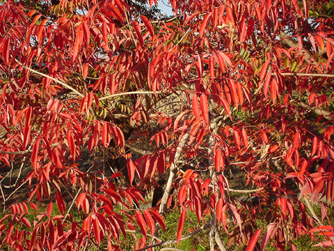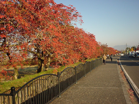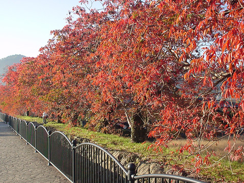 久留米市の中心街から国道210号線を日田方面に向かって約7キロばかり行った所にある柳坂曽根のハゼ並木。この並木道には旧豊後街道の柳坂をはさんで、国道201号と耳納山麓までの1.1キロにわたって、200本ものハゼが並んでいます。ハゼの紅葉による赤の見事さはもう圧巻です。 このハゼ並木は久留米藩が1730年ころから灯明用のろうの原料にするために植えたものであり、ロウは米に次ぐこの地方の特産品として全国に知られており、その名残が現在も並木として生き続けています。
