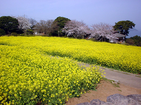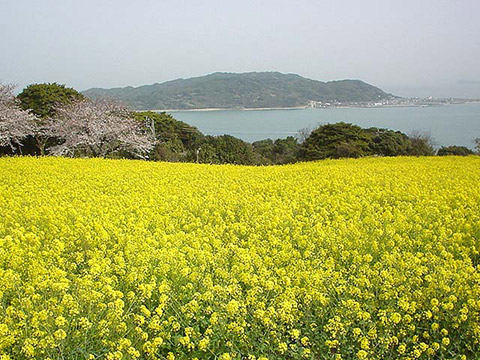 周囲約12キロメートル、奈良時代の万葉集にも登場し、放浪の作家壇一雄が晩年を過ごした島として有名です。その島の北部に位置する「のこのしまアイランドパーク」には、春の陽を浴びて、黄色い菜の花がいっぱいに咲き誇っています。